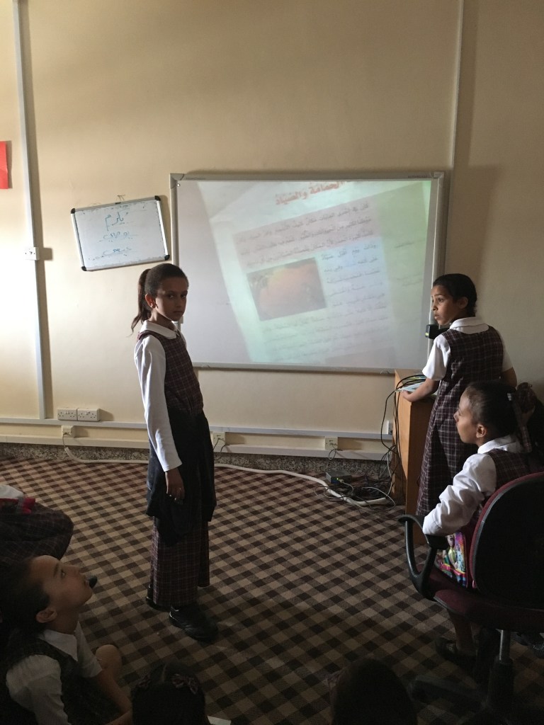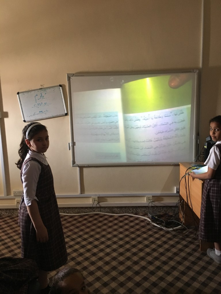 This page shows pictures and videos that demonstrate a success story in using documentary camera in teaching and learning. The following pictures and videos show that students are presenting one of the stories from their arabic book by using documentary camera.